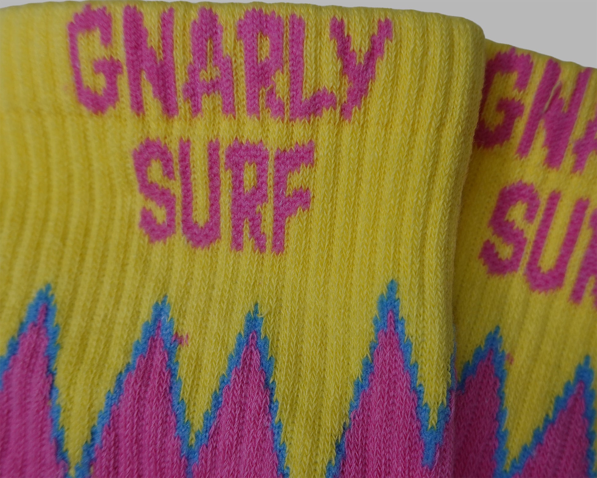 Add a pop of stoke to every step with the Gnarly Surf Socks. Featuring a bold pink-and-yellow design with retro zig-zag detailing, these socks bring beach-day energy to your everyday style. The “Gnarly Surf” lettering up top makes sure everyone knows you’re repping the laid-back, wave-chasing lifestyle.